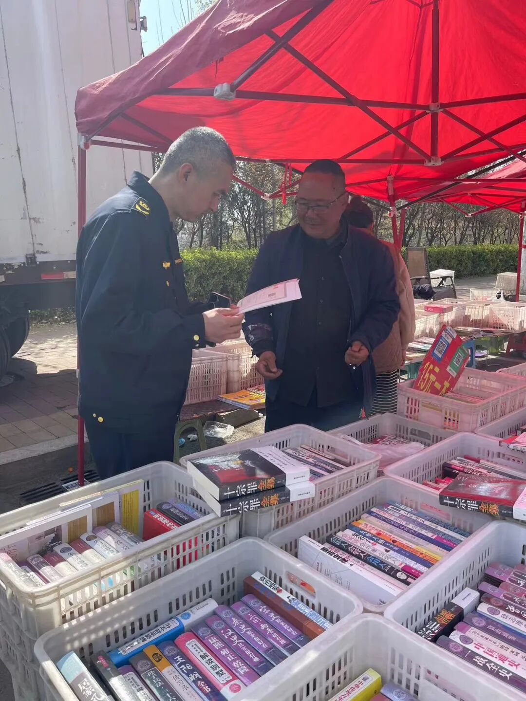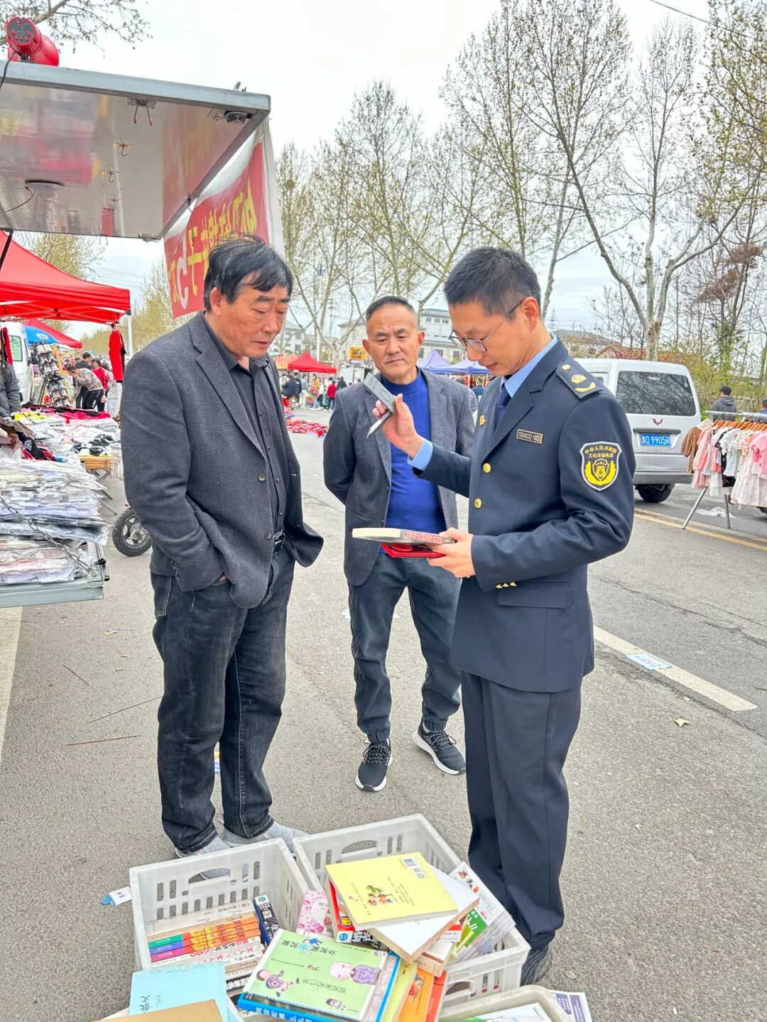 执法人员对校园周边书店及青檀庙会中出版物经营摊贩开展专项检查,重点核查各类非法、盗版有害的图书、音像制品,严查宣传淫秽色情、凶杀暴力、封建迷信等违禁内容的音像制品及出版物,同时加大对出版物市场从业人员的宣传教育,科普“扫黄打非”相关法律法规,要求经营场所严格落实主体责任,守法经营,自觉抵制非法出版物。