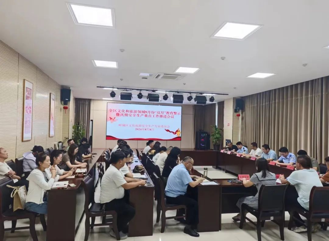 8月8日下午,峄城区文化和旅游领域8月份“双月”教育警示暨汛期安全生产重点工作推进会议在区文旅局国学大讲堂会议室召开。区文旅局、区公安分局、区交通运输局、区市场监管局、区消防救援大队等区文化旅游安全生产专业委员会成员单位分管负责人,各镇(街道)分管负责人及具体负责人,全区各文旅经营企业负责人参加会议。