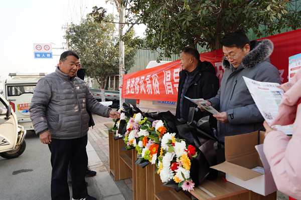 “焚烧冥币纸钱易污染环境、引发火灾,我们为您准备了鲜花,可以用纸钱来换,绿色、文明的生态祭祀方式让环境更美好!”在新春佳节到来之际,1月13日,恰逢左庄年集,枣庄市峄城区峨山镇组织殡改办工作人员走上街头,开展春节文明祭扫宣传活动,进一步推进移风易俗工作。记者在现场看到,志愿者的宣传内容,与赶集购买祭扫物品的群众“不谋而合”。多数群众主动购买鲜花,或在鲜花置换点用纸钱换取鲜花,以进献鲜花为主的方式进行祭扫,让墓地一改从前烟火缭绕的情况,让环境更加“清明”。同时,也让人真切感受到“鲜花换纸钱”的文明祭扫新风尚已渐入人心。(李利 王伟)