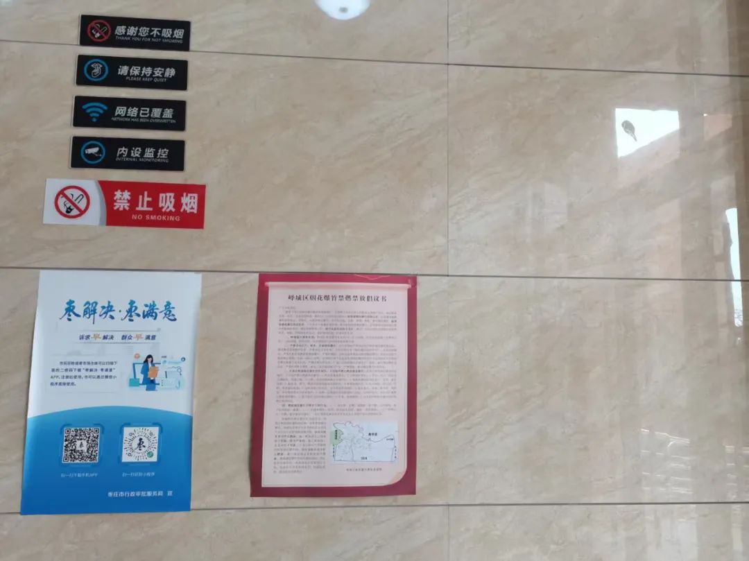在大厅显著位置张贴《峄城区烟花爆竹禁燃禁放倡议书》;在办事窗口设置宣传点,主动向办事群众发放宣传单;充分利用多媒体设备,循环播放禁燃禁放宣传教育视频。视频中,选取了3起违规燃放烟花爆竹的典型案例,展示违规燃放烟花爆竹引发火灾后的严重后果,让群众直观感受到违规燃放烟花爆竹的安全隐患。