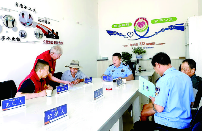 图为7月14日,阴平派出所民警与驻所司法调解员对辖区一起邻里纠纷进行调解。季 龙 摄