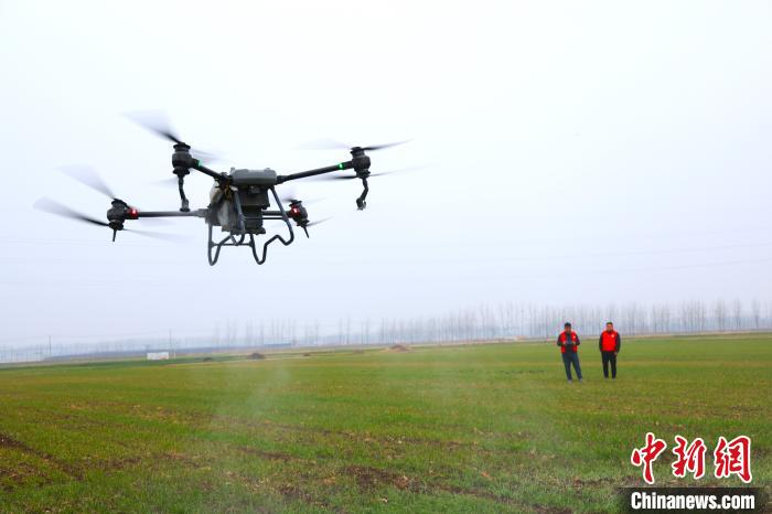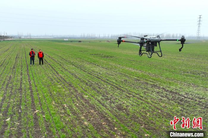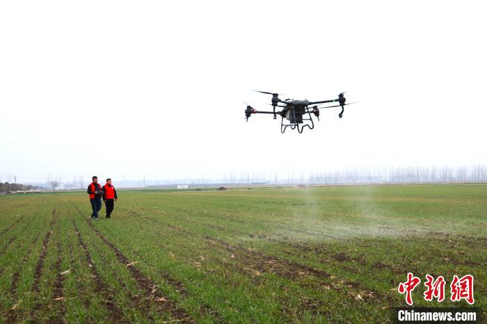 3月4日,惊蛰节气将至,山东省枣庄市峄城区古邵镇大刘庄村的农民抢抓农时开展春耕备耕工作,无人驾驶植保机在小麦田里喷洒除草剂和杀虫剂,确保小麦丰产丰收。