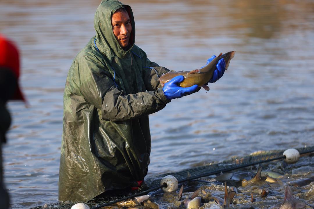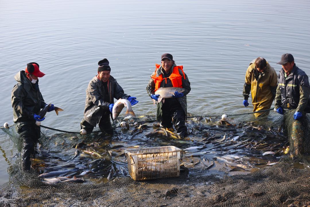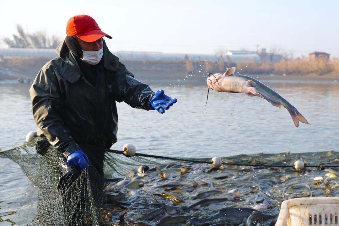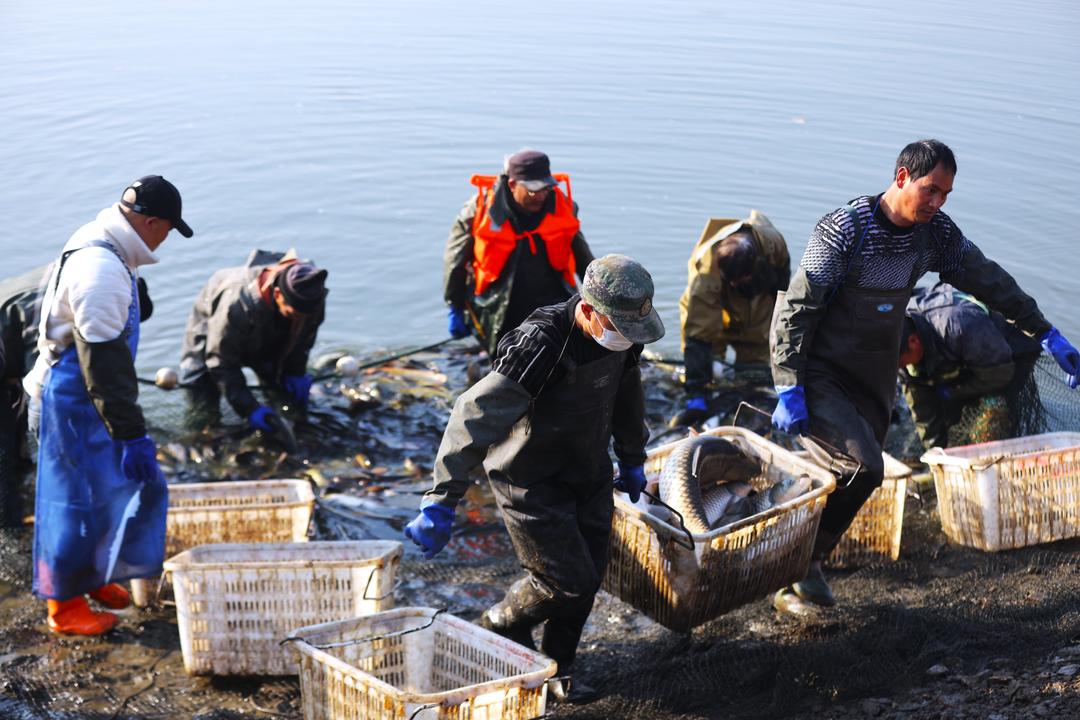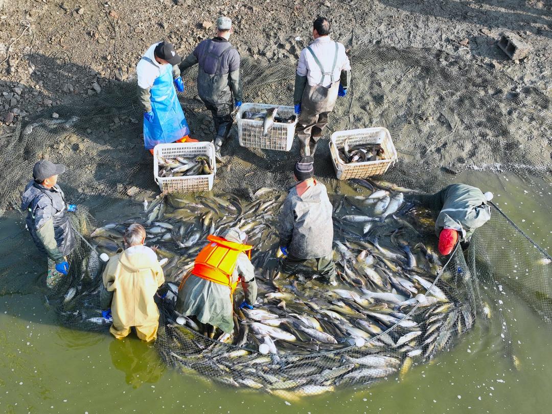 连日来,枣庄市峄城区底阁镇康庄村养鱼基地迎来冬捕季,河面上鱼跃人欢,养殖户们忙着分拣、装车外运,供应春节市场。