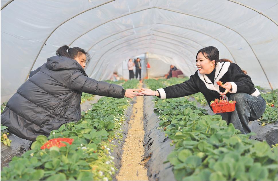 枣庄市峄城区一处大棚内,游客正在采摘草莓。该采摘大棚推出线上预订与线下采摘相结合的销售模式,不少市民前来体验采摘乐趣,品尝新鲜草莓的美味。(记者 孟令洋 通讯员 孙慧)