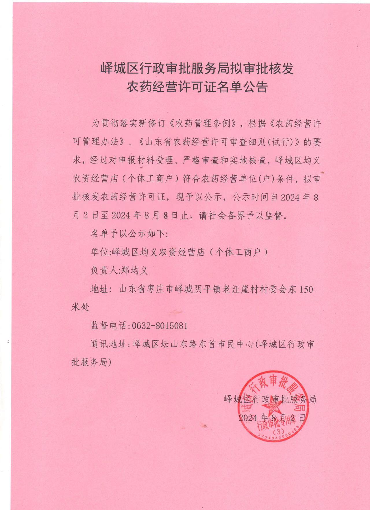 峄城区行政审批服务局关于峄城区均义农资经营店拟审批核发农药经营许可证公告