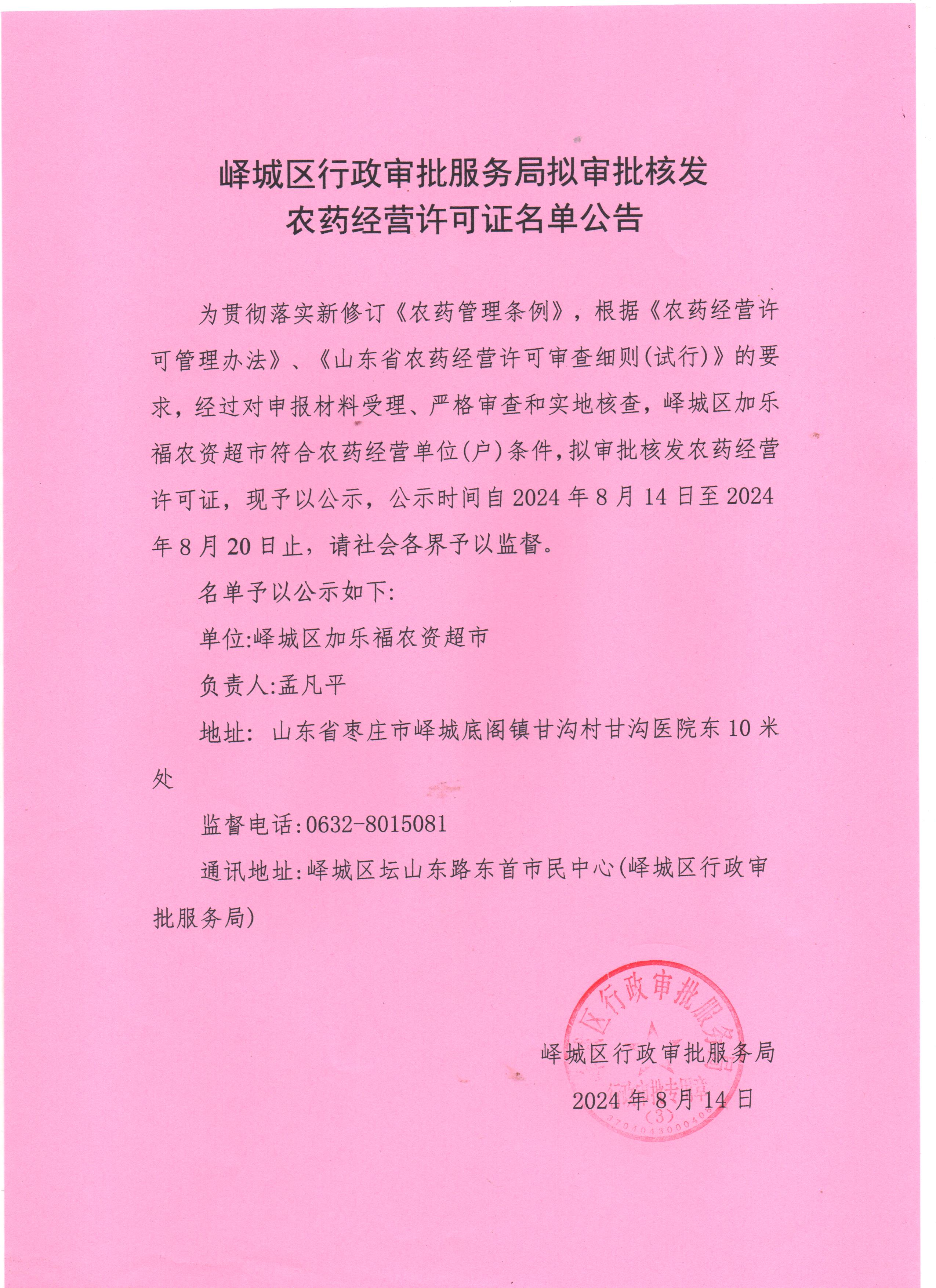 峄城区行政审批服务局关于峄城区加乐福农资超市拟审批核发农药经营许可证公告