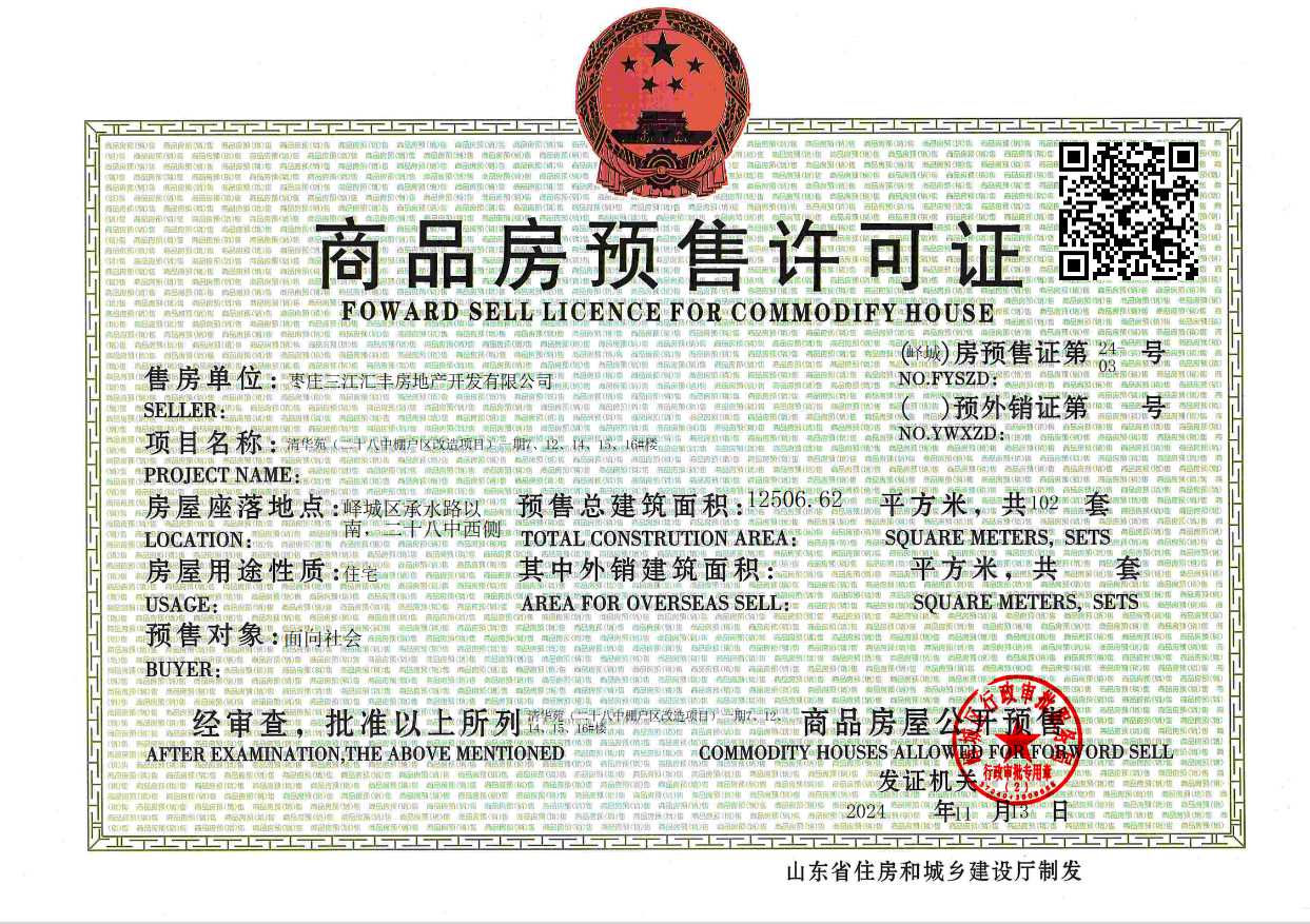 枣庄三江汇丰房地产开发有限公司申请办理清华苑(二十八中棚户区改造项目)一期7、12、14、15、16#楼商品房预售许可的事项已经我局审批完毕,现将商品房预售许可内容进行公告。