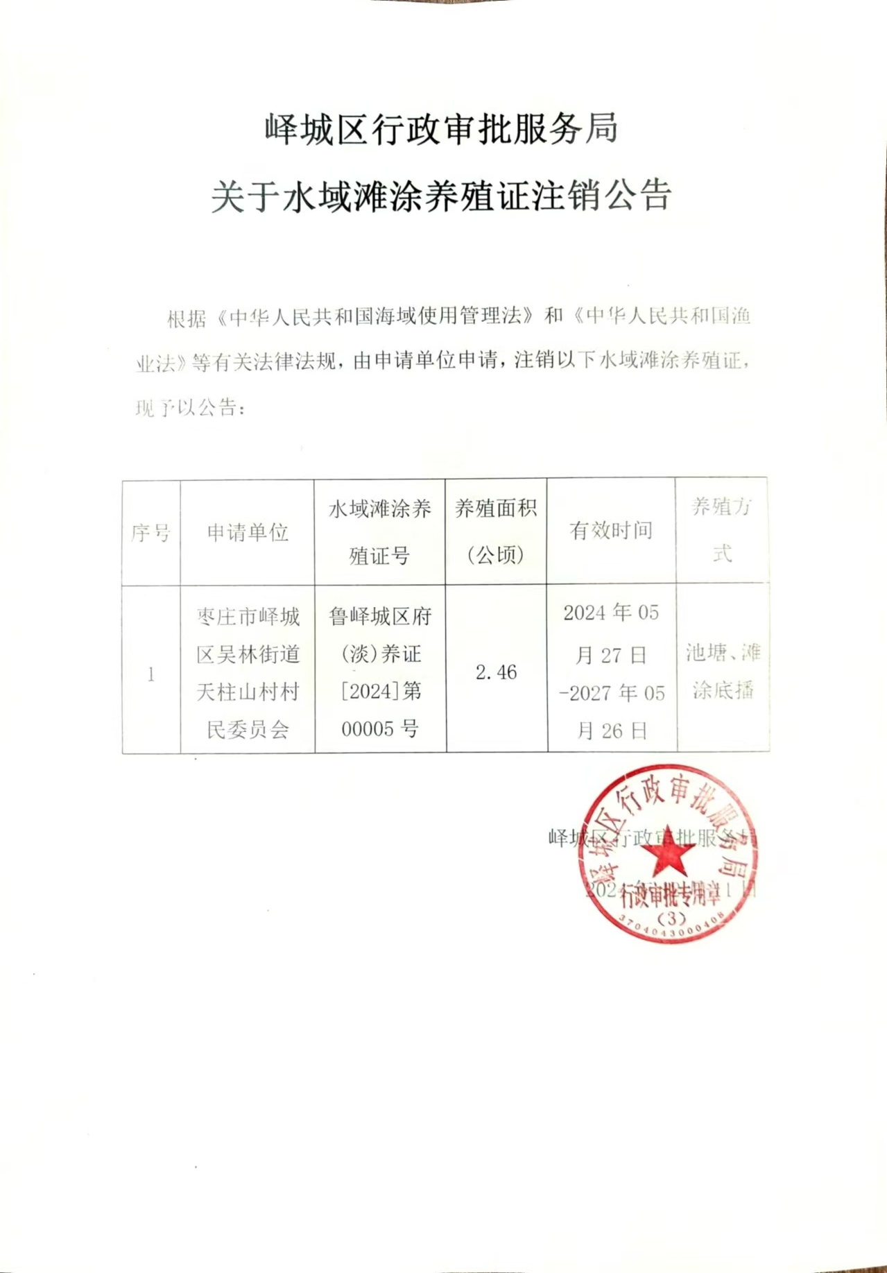 峄城区行政审批服务局关于水域滩涂养殖证注销公告