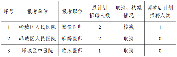2024年度峄城区卫生健康系统公开招聘工作人员报名工作已经结束。鉴于部分招聘岗位报名人数未达到规定的1:3开考比例,根据《2024年度峄城区卫生健康系统公开招聘工作人员简章》及有关规定,现将调整的岗位计划公布如下: