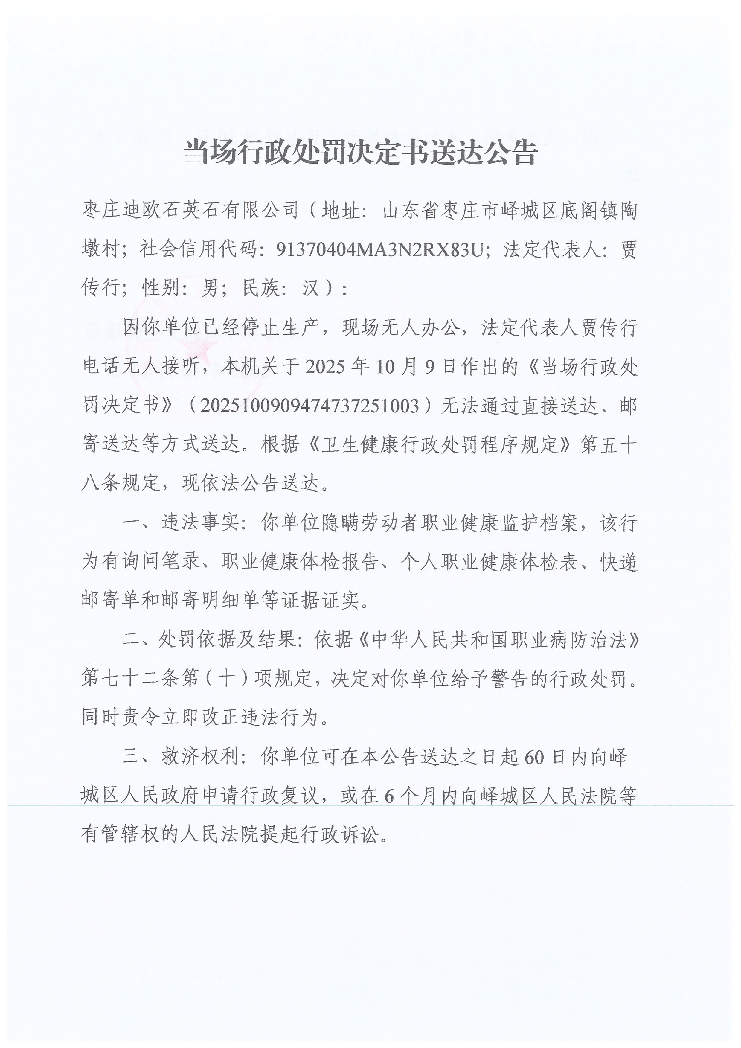 当场行政处罚决定书送达公告