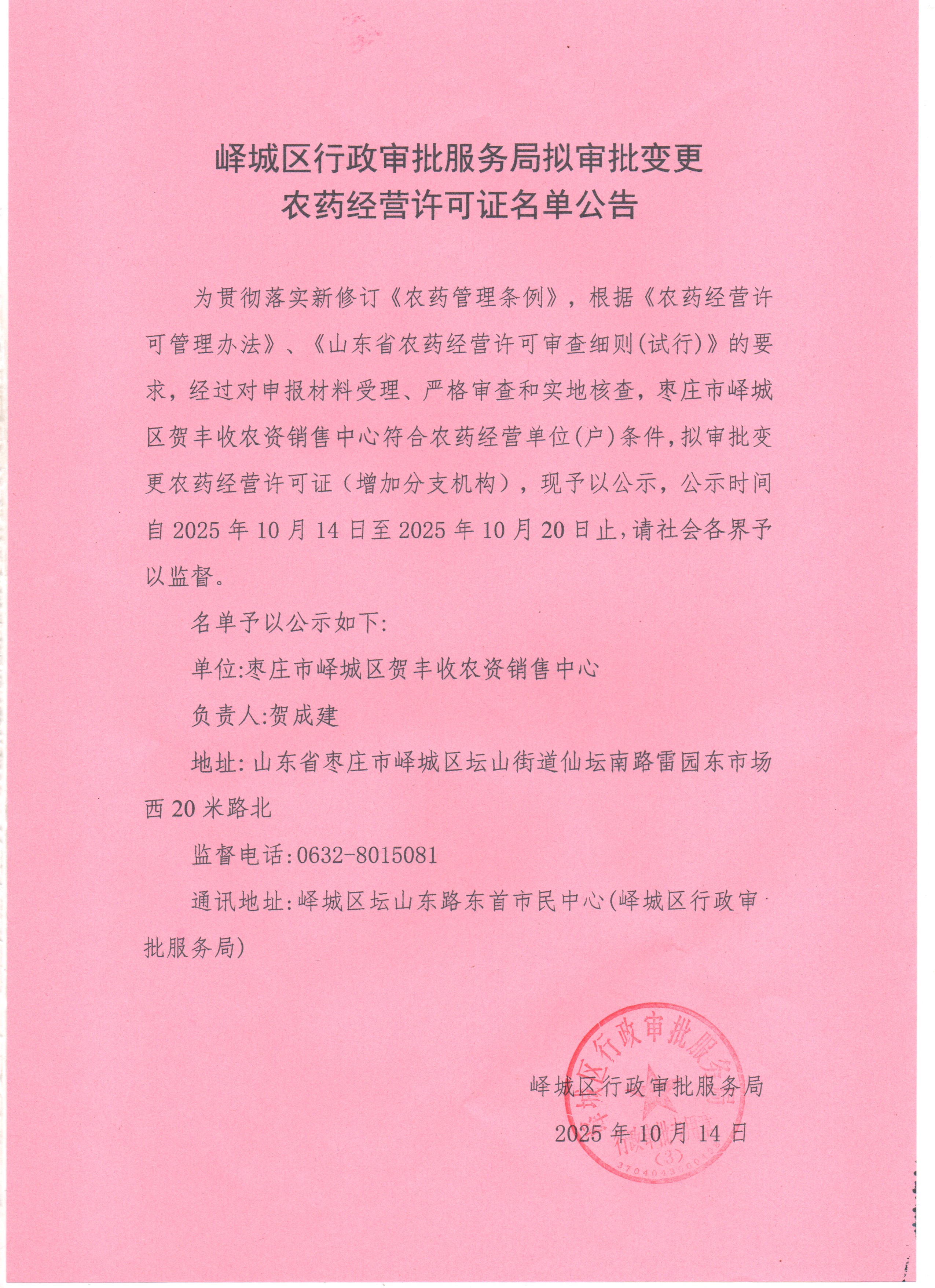 峄城区行政审批服务局关于枣庄市峄城区贺丰收农资销售中心拟审批变更农药经营许可证公告