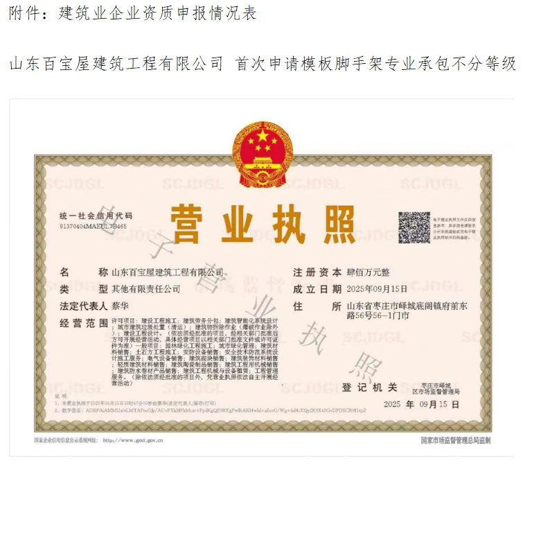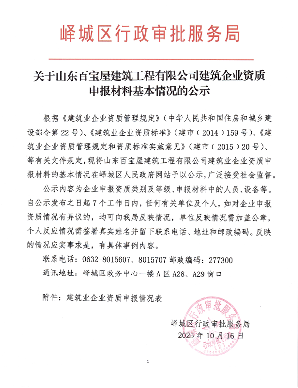 关于山东百宝屋建筑工程有限公司建筑企业资质 申报材料基本情况的公示