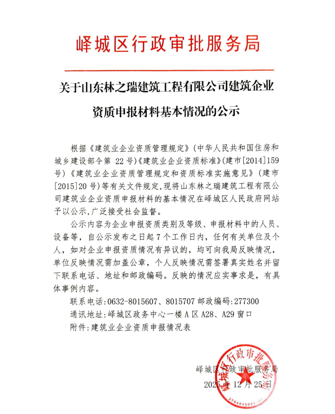 关于山东林之瑞建筑工程有限公司建筑企业资质申报材料基本情况的公示