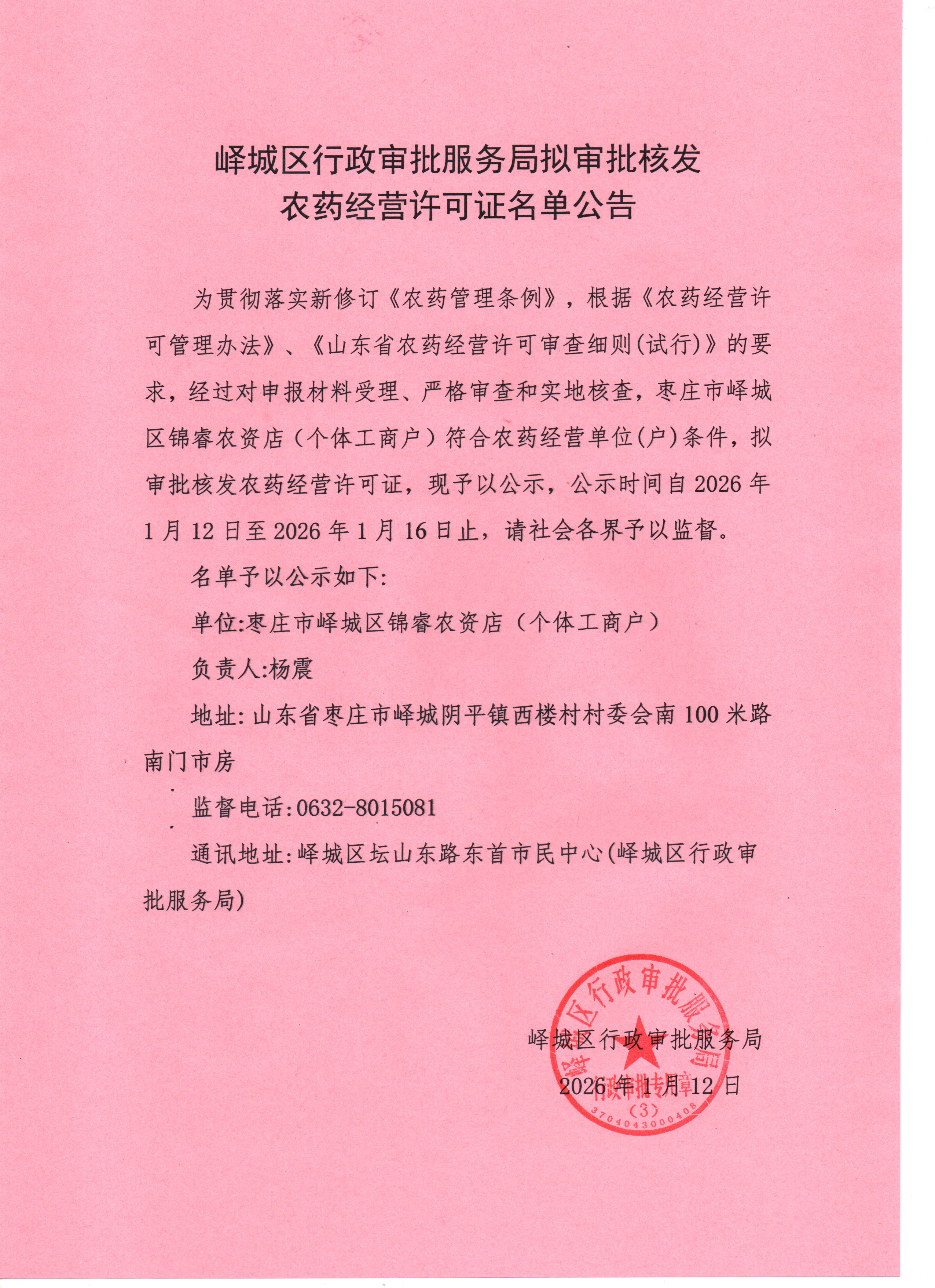 峄城区行政审批服务局关于枣庄市峄城区锦睿农资店拟审批核发农药经营许可证公告
