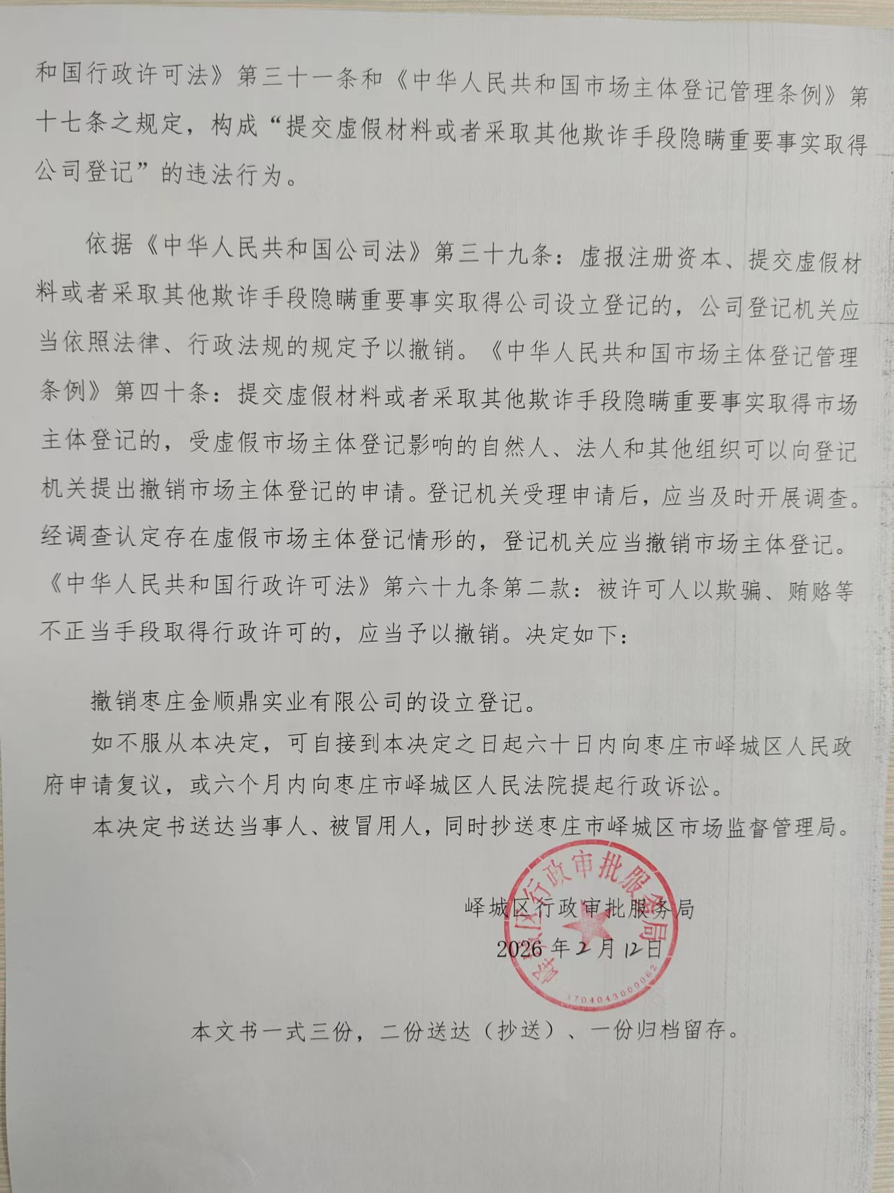 峄城区行政审批服务局关于撤销枣庄金顺鼎实业有限公司设立登记的决定
