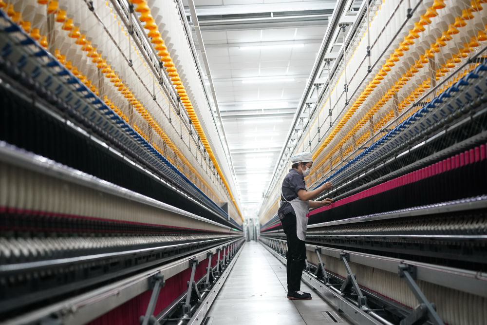 4月5日,工人在江苏泰达纺织科技有限公司智慧化纺纱工厂作业。新华社记者 季春鹏 摄