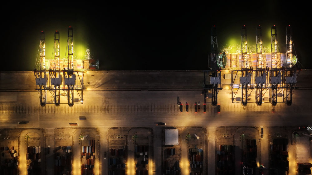 3月4日,在钦州港集装箱自动化码头,塔吊进行夜间作业(无人机照片)。新华社记者 张爱林 摄