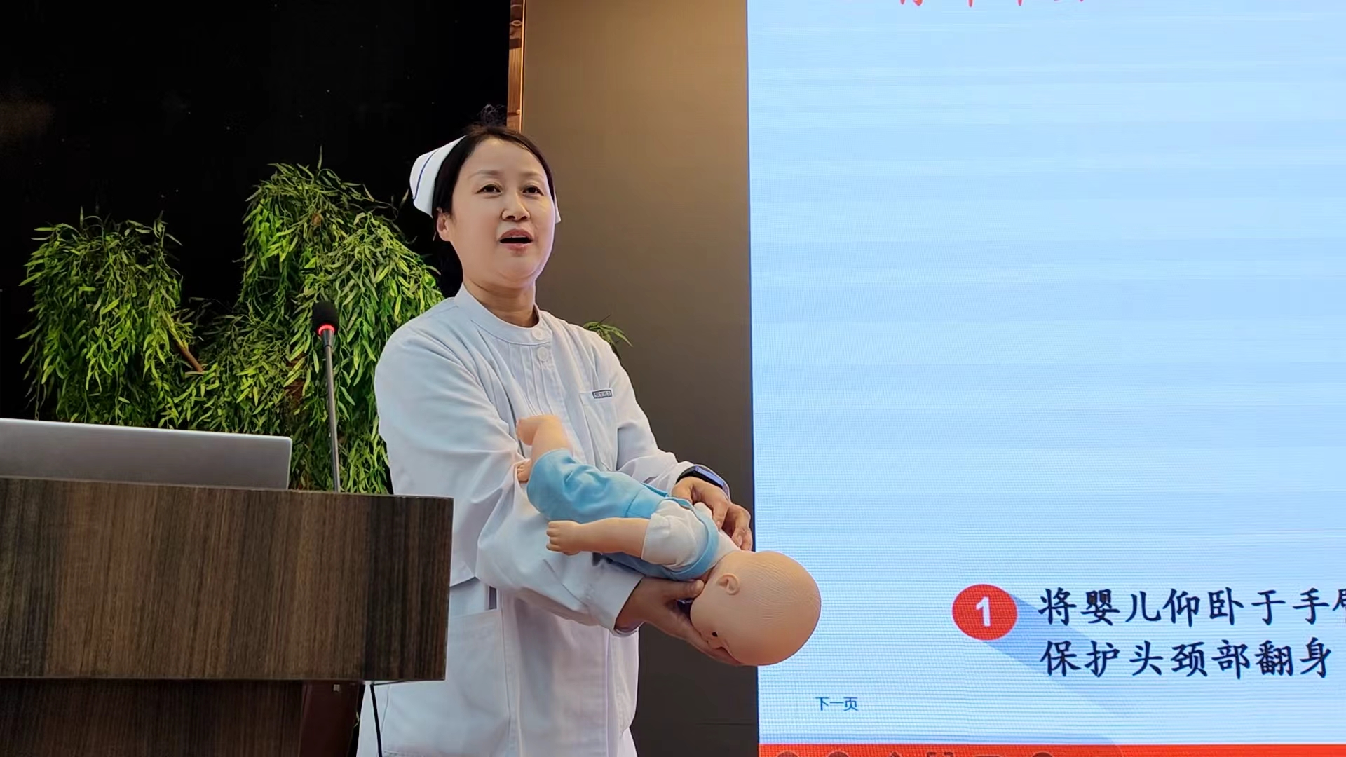 随后,ICU李莉护士长针对气道异物梗阻问题,讲解海姆立克急救法,不仅介绍成人“剪刀、石头、布”口诀,还演示儿童与婴儿的特殊操作手法。互动环节中,学生们踊跃举手上台,在护士长指导下认真演练“生命的拥抱”,将知识转化为实践技能。