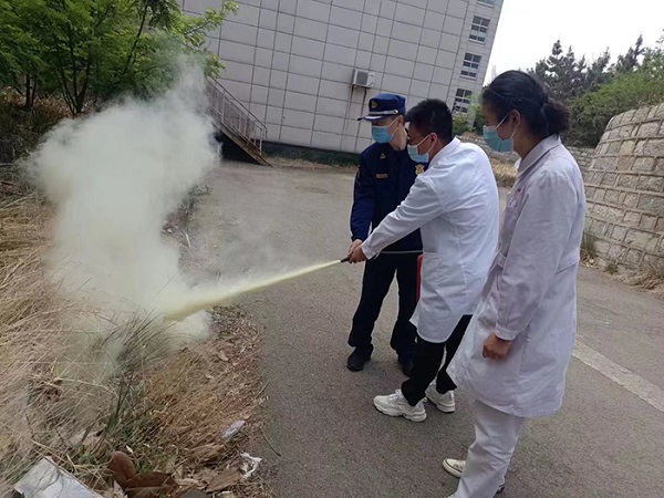 最后,大队宣传人员现场演示了灭火器使用方法,并模拟火情,组织医疗机构参训人员开展了灭火演练。