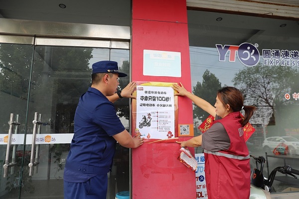 活动中,大队宣传人员结合快递、外卖行业典型火灾案例,从电动自行车的火灾特点、易发生火灾的原因,全面分析了快递、外卖行业中存在的问题。督促从业人员坚决不使用不合格的电动自行车及蓄电池,不在楼道、楼梯间、安全出口等公共区域和室内停放充电以及拉“飞线”充电。同时发放了消防宣传彩页,并提醒他们养成良好的消防安全行为习惯,坚决做到电动自行车不进楼、不进梯、不入户,规范停放。