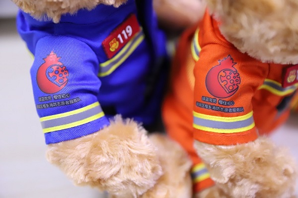 大队以“简约直观、便携亲民”为出发点,设计制作印有消防主题元素的扑克牌、扇子、笔袋、书皮、消防小熊以及系列卡通钥匙扣等消防文创宣传作品。其中,消防小熊以地方特色与消防元素相结合,设计带有峄城区榴乡消防志愿者服务队的LOGO,图案以石榴和火焰为主题,下方印有“峄蓝向党、榴住初心”字样,充分展现了石榴红文化与消防元素碰撞的火花。