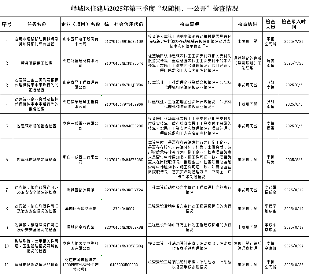 峄城区住建局2025年第三季度“双随机、一公开”检查情况
