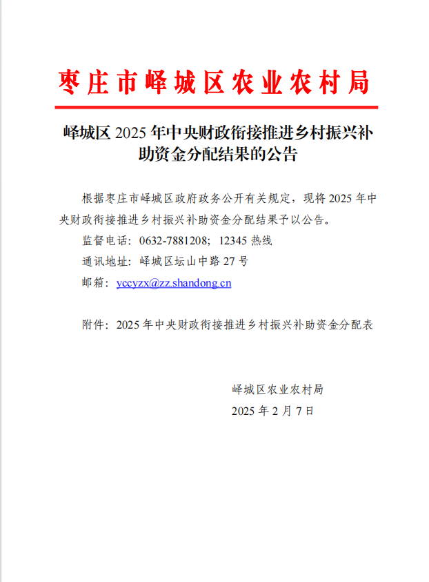峄城区2025年中央财政衔接推进乡村振兴补助资金分配结果的公告