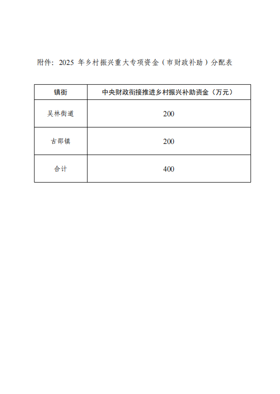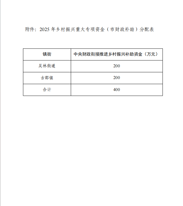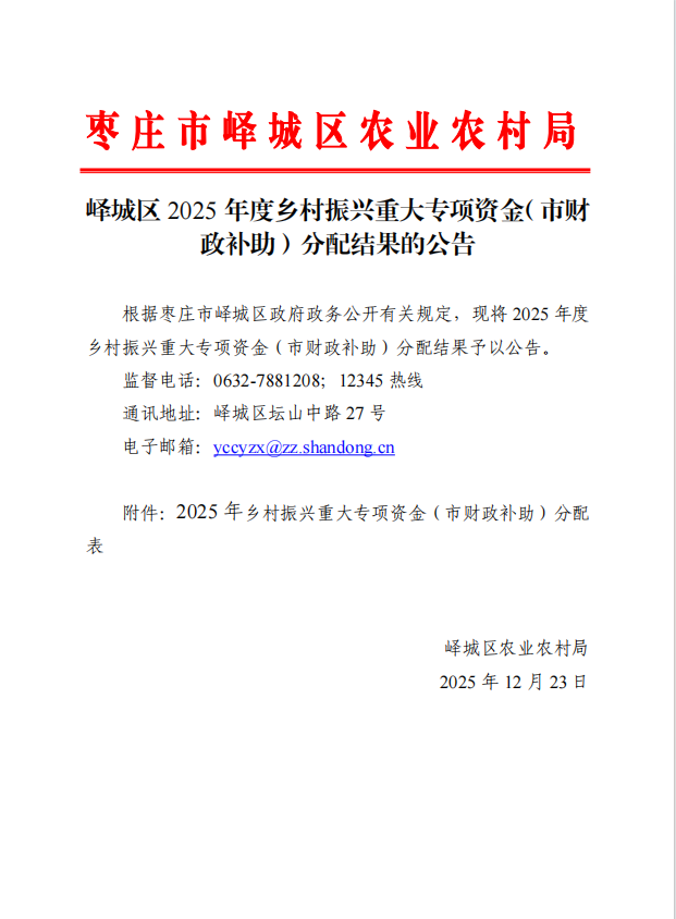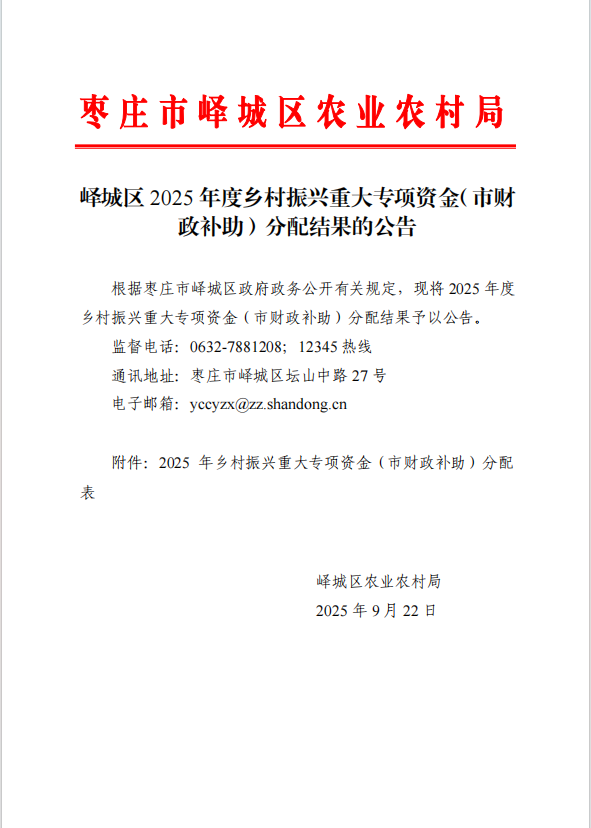 峄城区2025年度乡村振兴重大专项资金(市财政补助)分配结果的公告