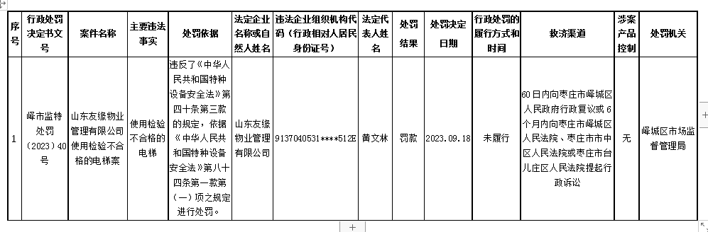 峄城区市场监督管理局对山东友缘物业管理有限公司行政处罚信息