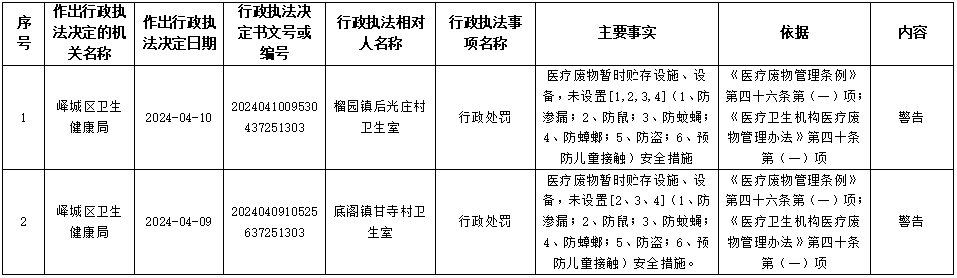 峄城区卫生健康局2024年4月9日、10日行政处罚信息