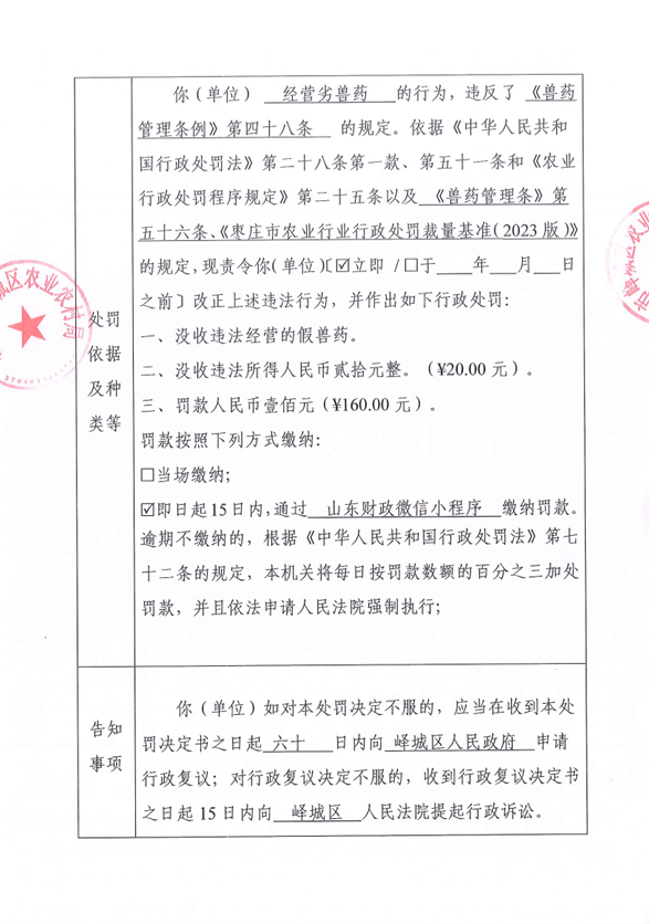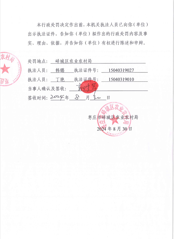 峄城区农业农村局2024年8月30日行政处罚信息