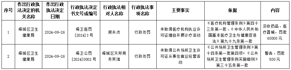 峄城区卫生健康局2024年9月26日行政处罚信息
