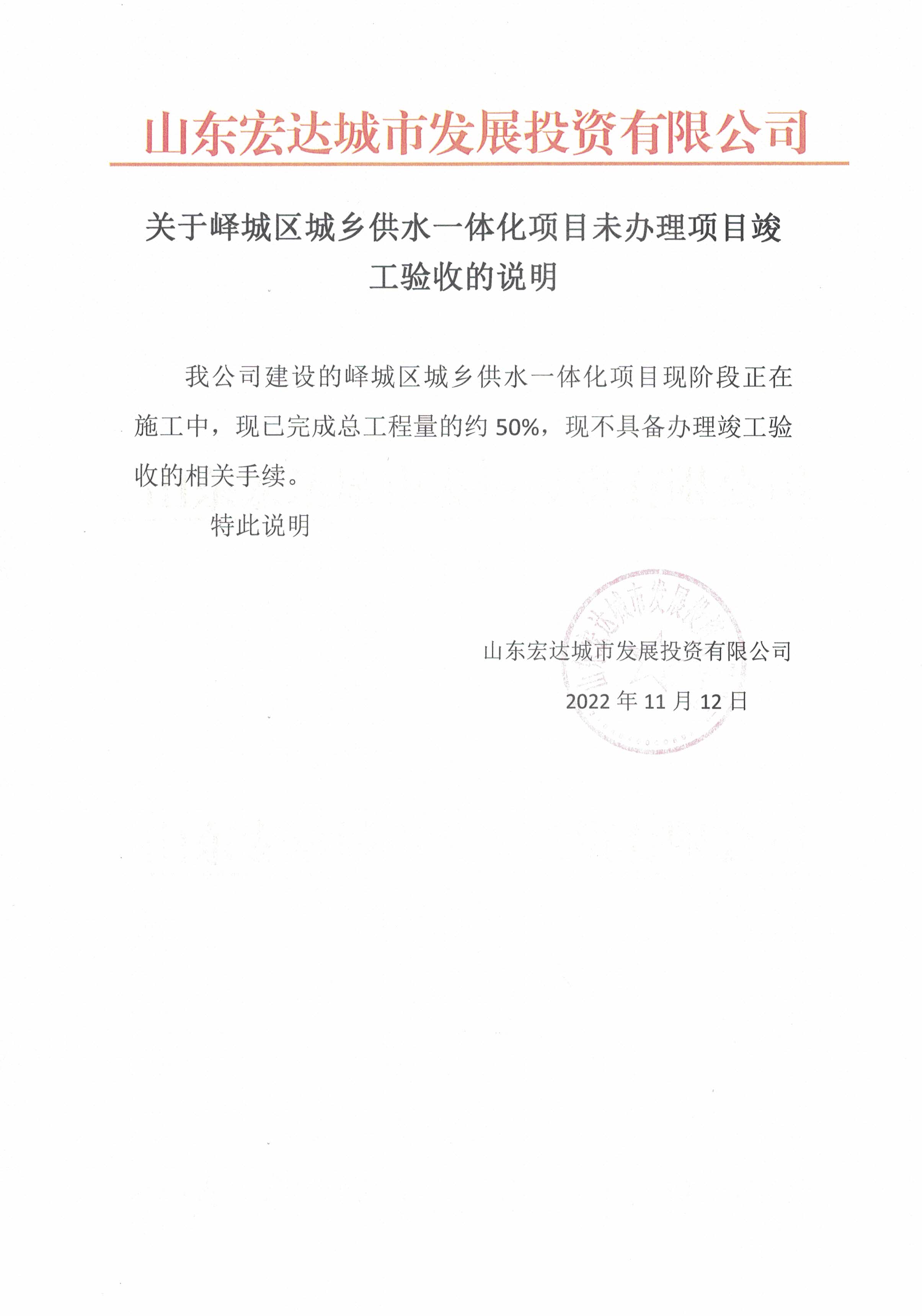 峄城区城乡供水一体化项目未办理项目竣工验收情况说明