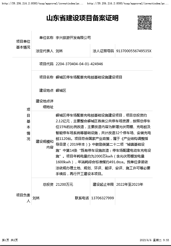 峄城区停车场配套充电桩基础设施建设项目备案证明