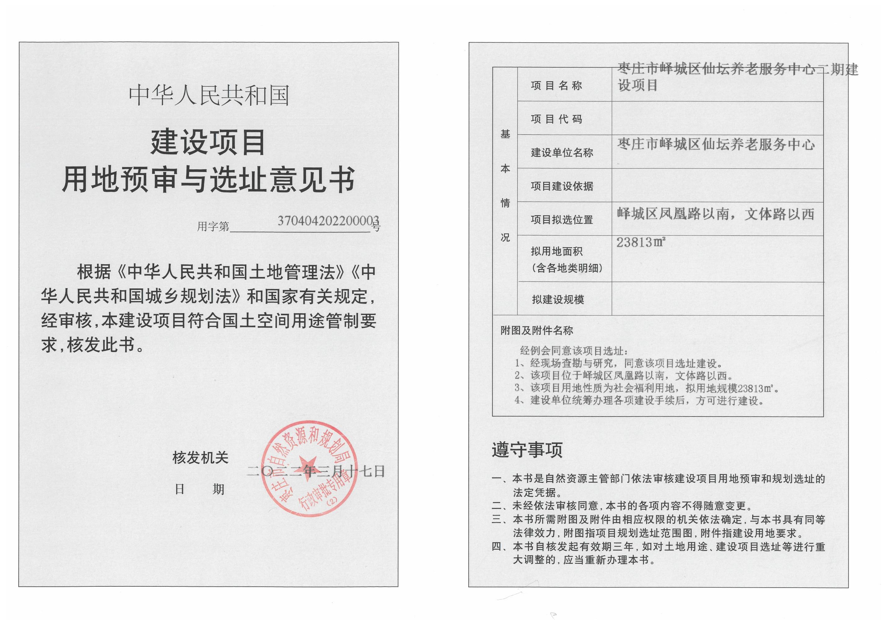 峄城区仙坛养老服务中心建设项目用地预审与选址意见信息
