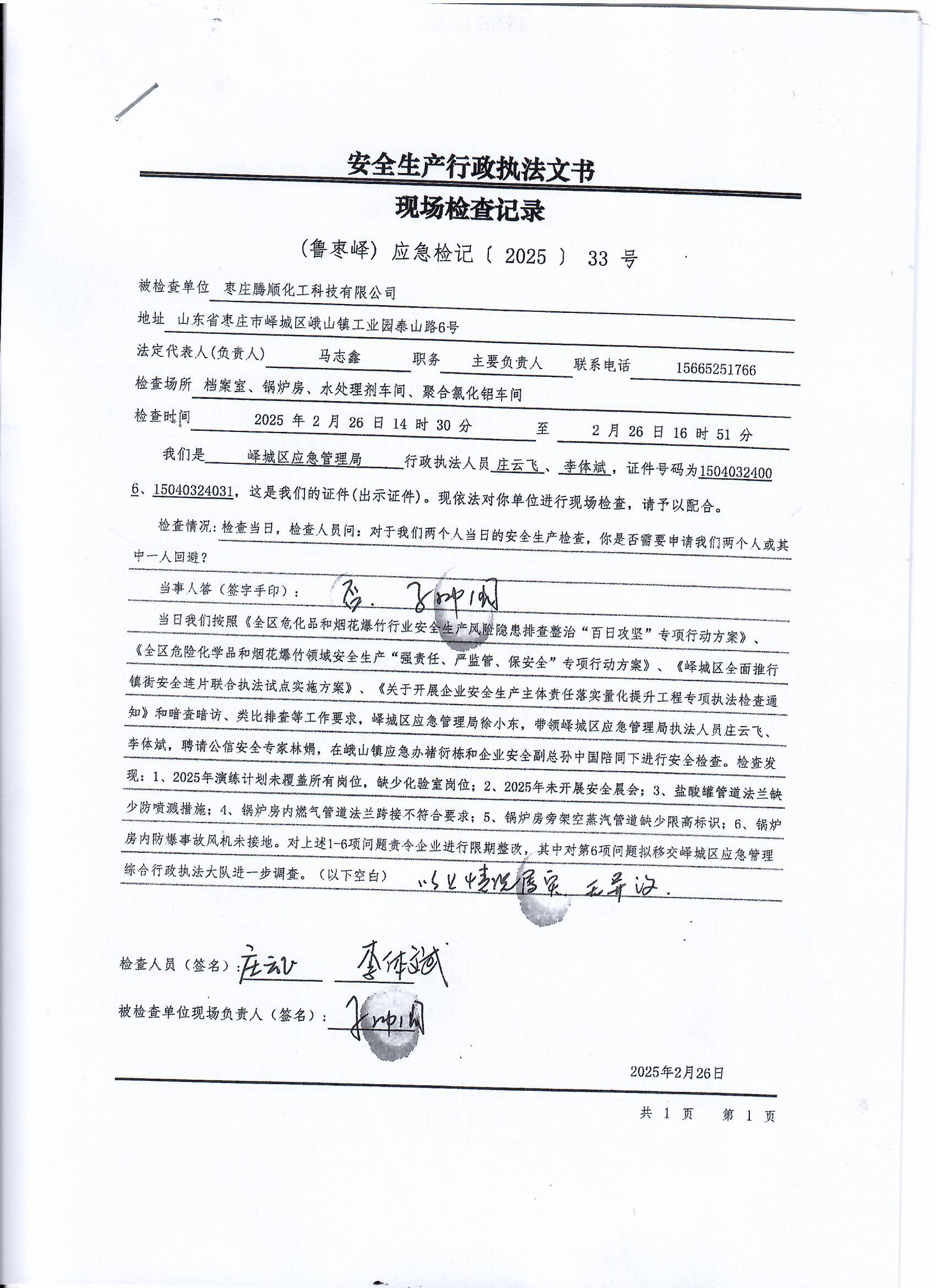 • 标  题:峄城区应急局对枣庄腾顺化工安全生产执法检查