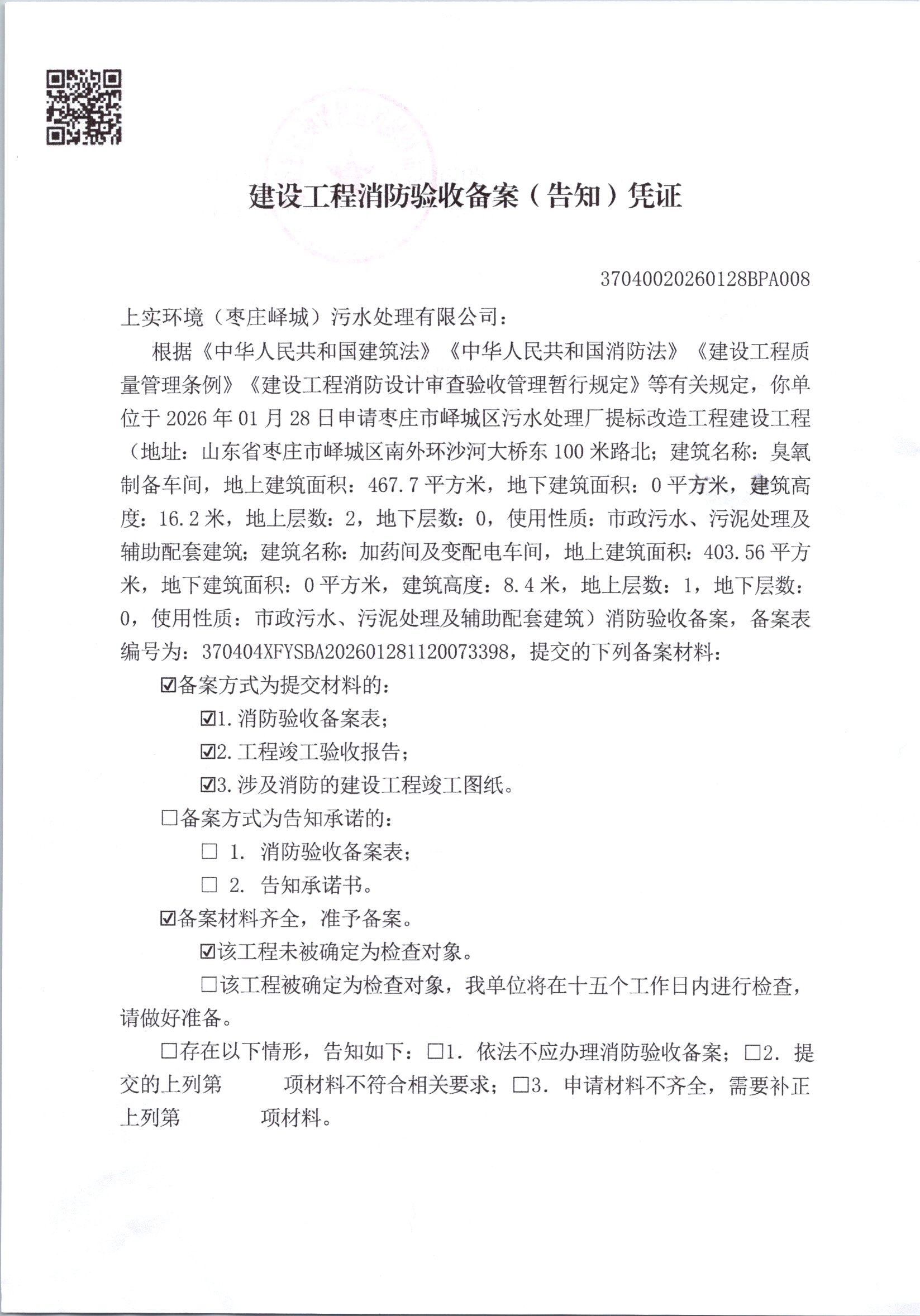 上实环境(枣庄峄城)污水处理有限公司污水处理厂提标改造工程消防验收备案