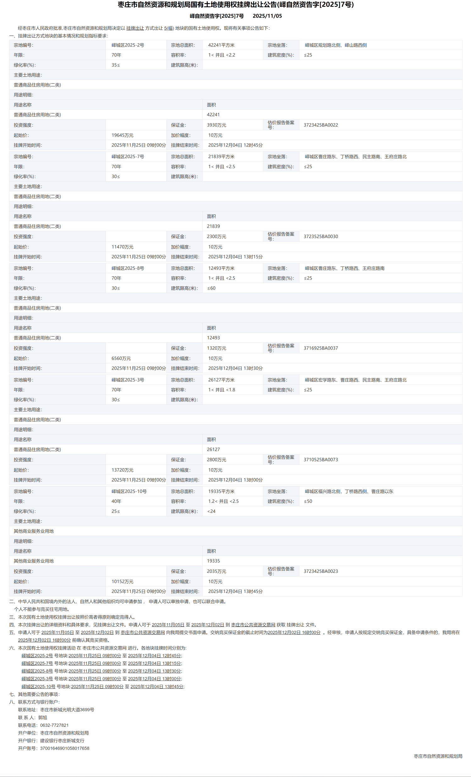 峄城区2025-2、3、7、8、10号国有建设用地使用权出让公告