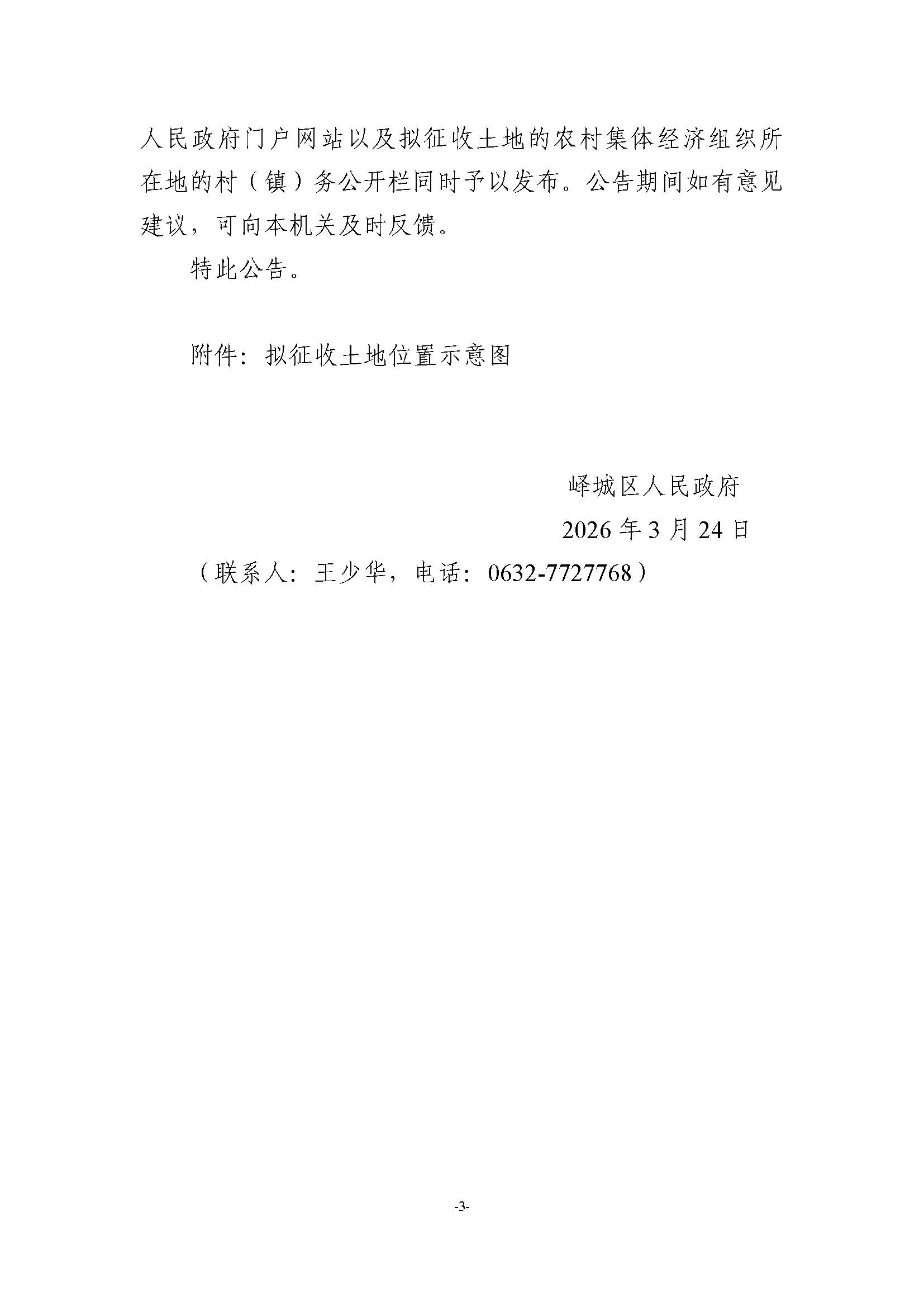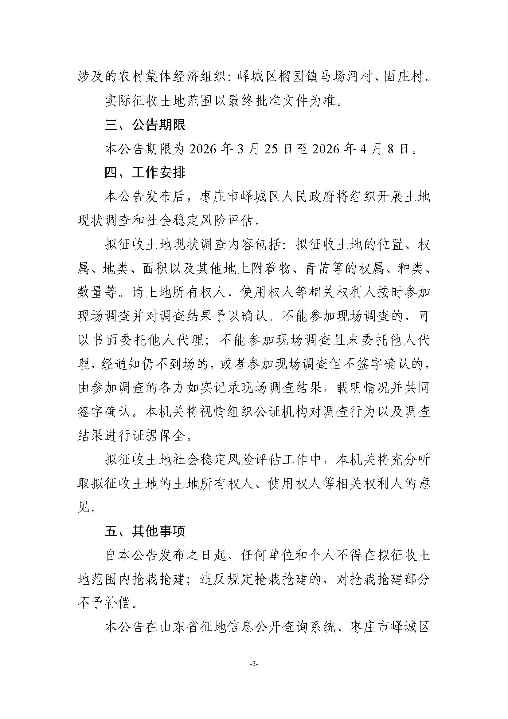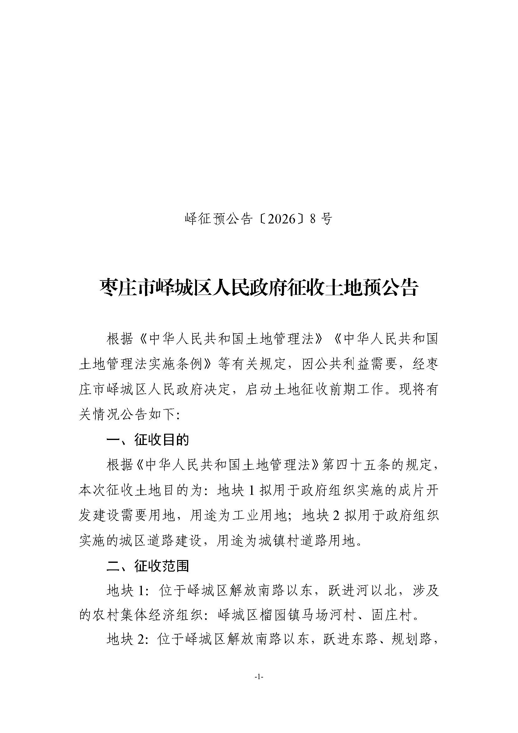 • 标  题:峄城区自然资源局发布征收土地预公告-榴园镇马场河村、固庄村(峄征预公告〔2026〕8号)