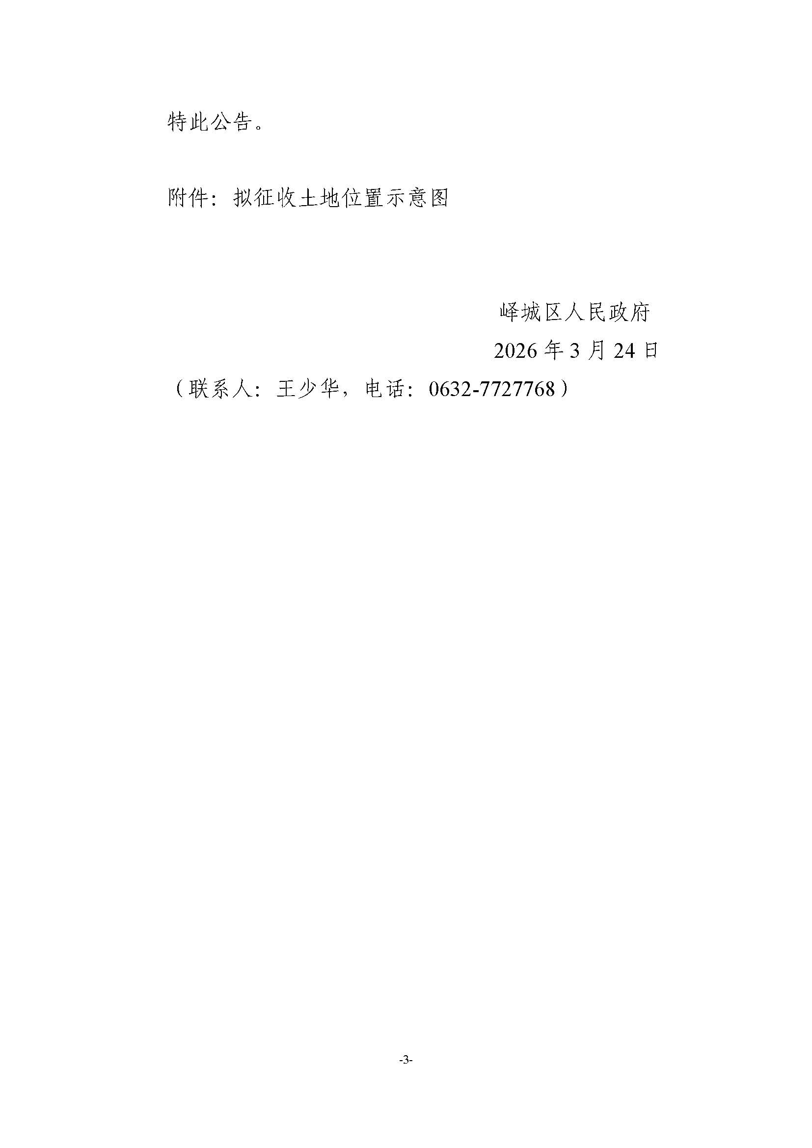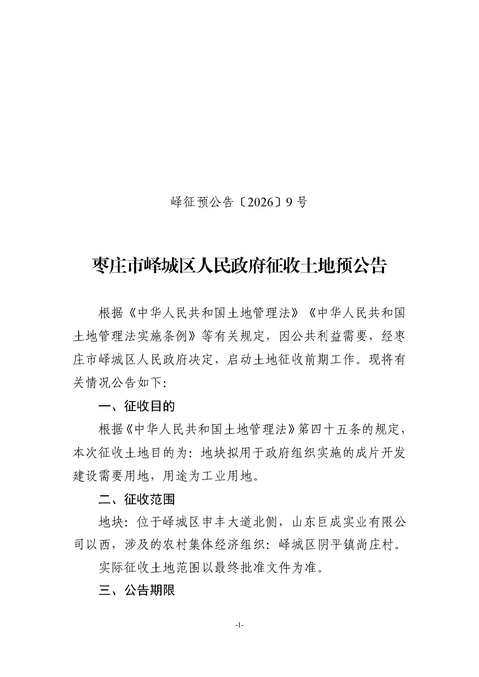 • 标  题:峄城区自然资源局发布征收土地预公告-阴平镇尚庄村(峄征预公告〔2026〕9号)