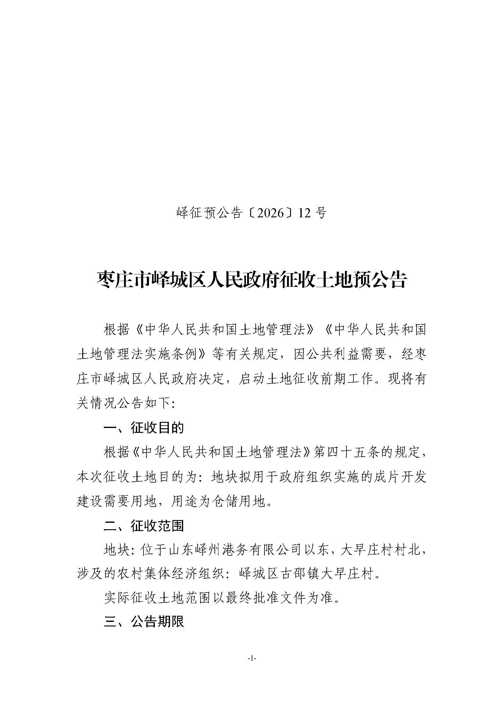 • 标  题:峄城区自然资源局发布征收土地预公告-古邵镇大早庄村(峄征预公告〔2026〕12号)